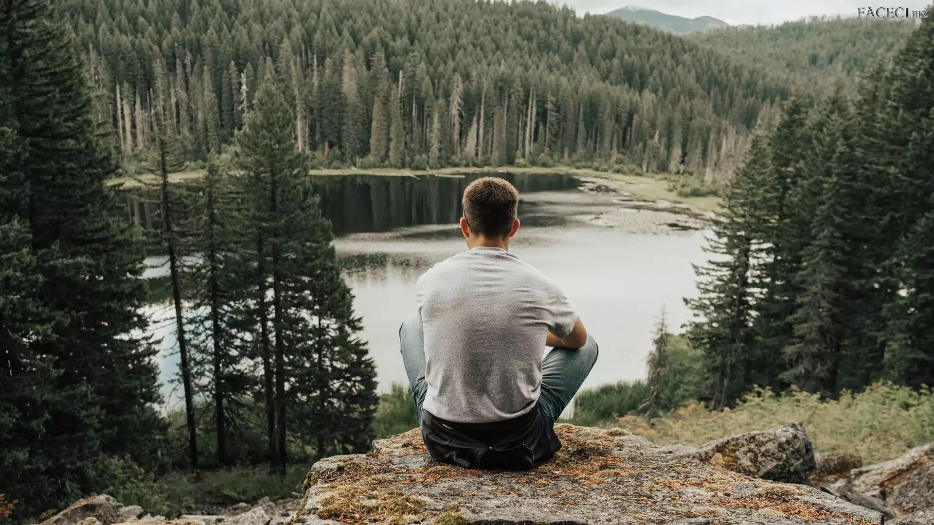 Jezioro, Lasy, Skała, Mężczyzna, Drzewa - faceci.biz